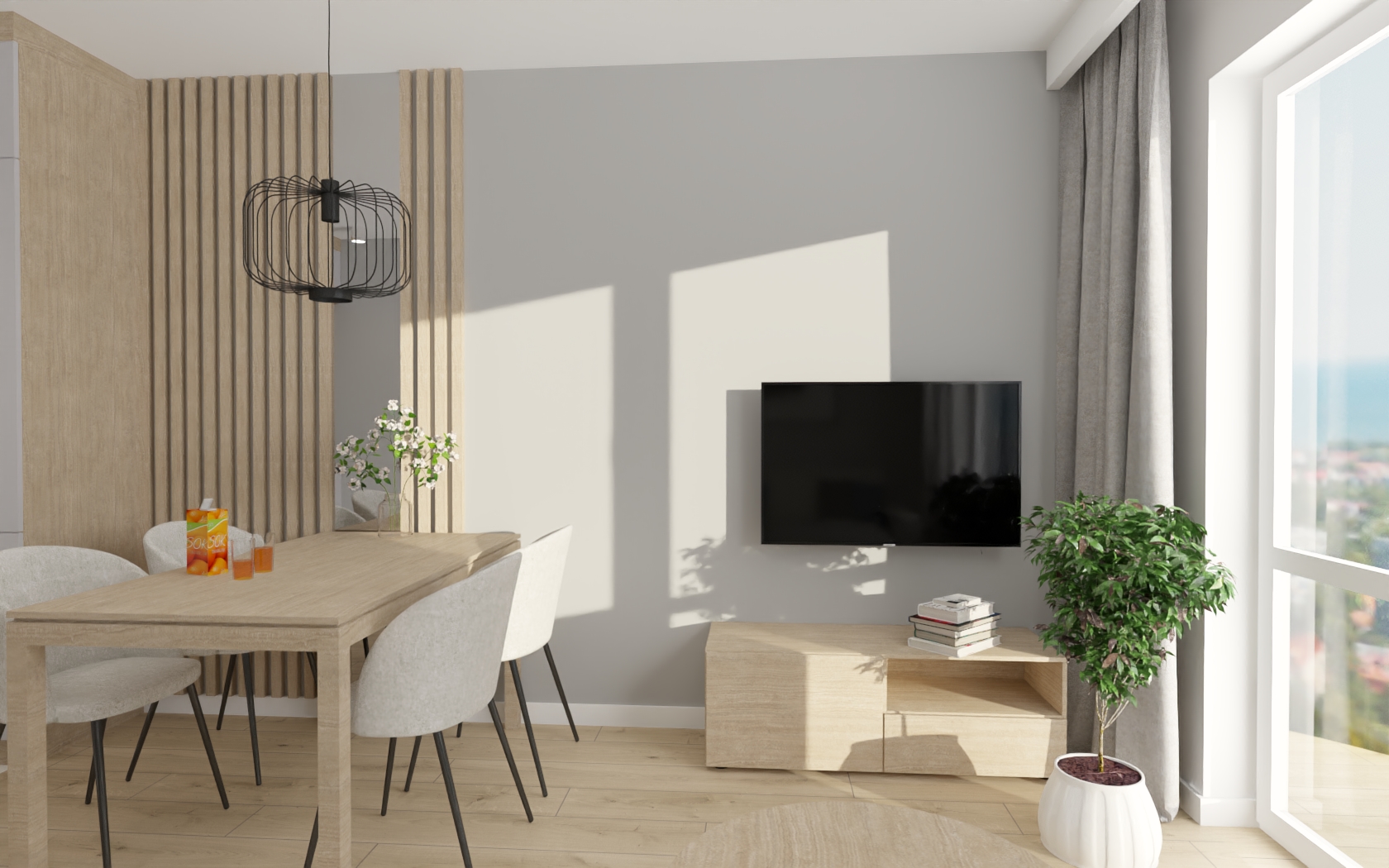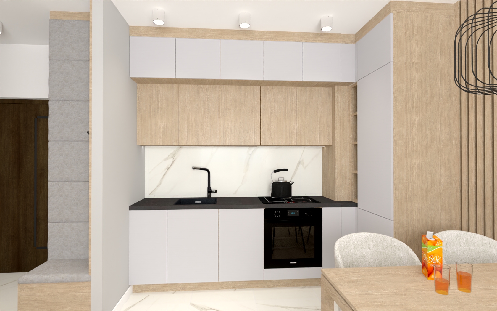 – Otwarty salon z aneksem kuchennym z wyjściem na balkon