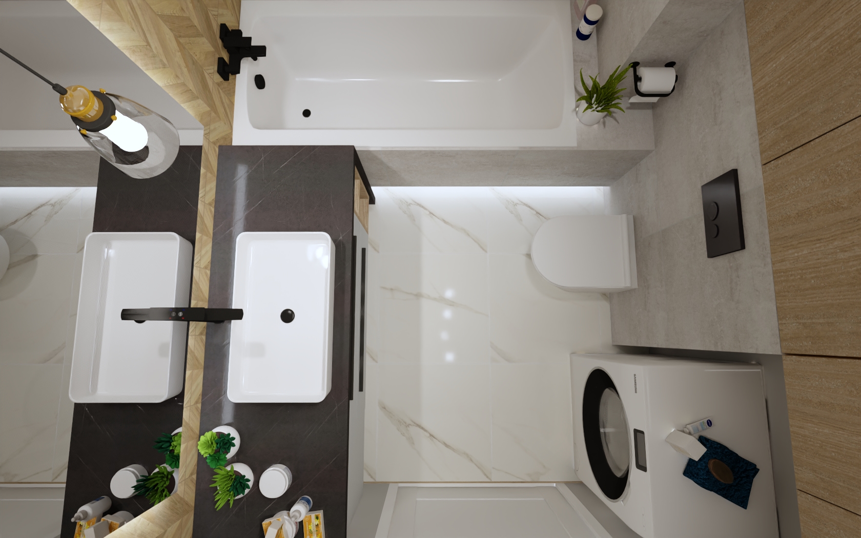 Na podłodze zostaną położone wysokij klasy panele oraz płytki .