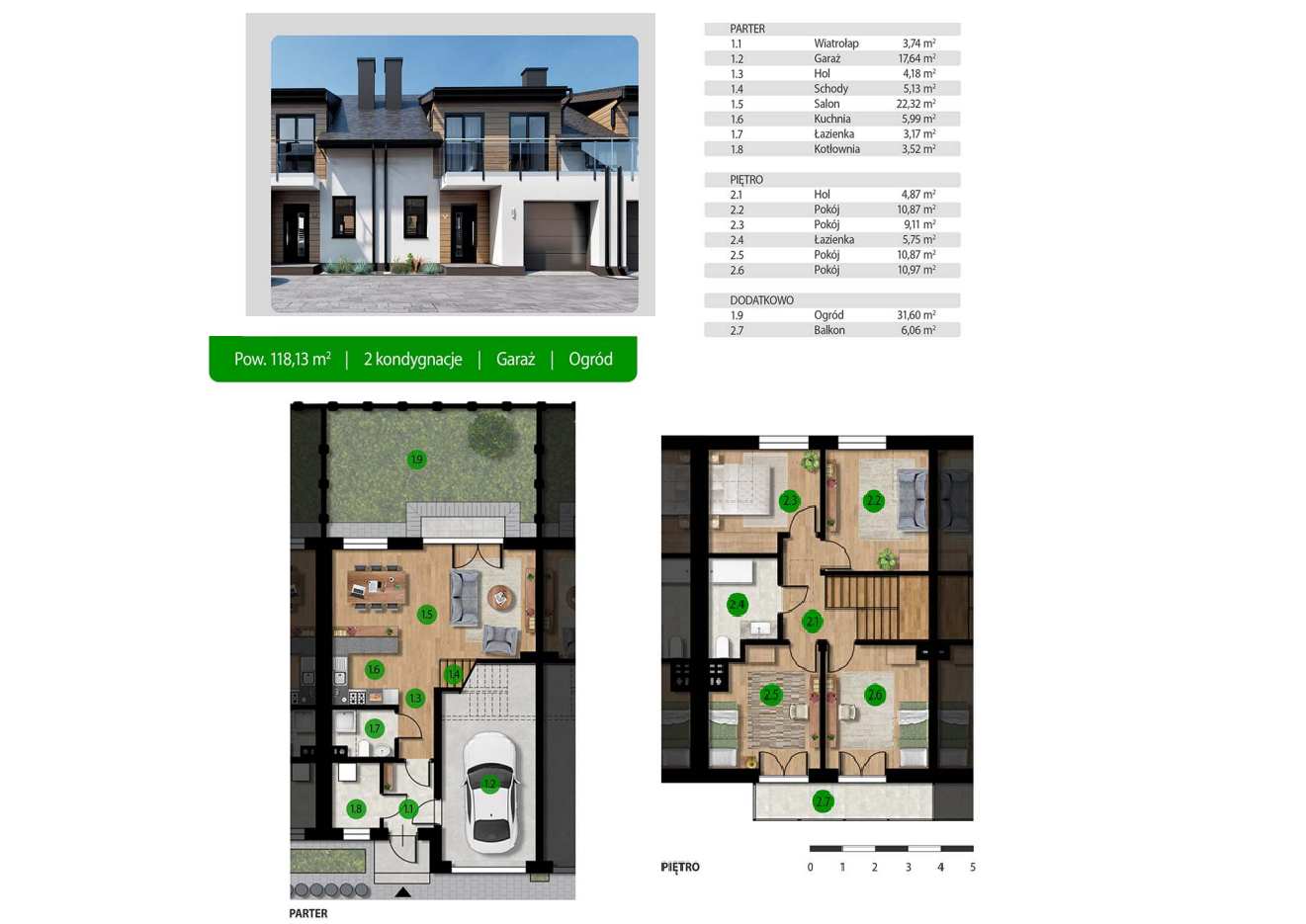 Dom składa się z 2 kondygnacji o powierzchni 118,13 m2 w którego skład wchodzi na I piętrze: przestronny salon z kuchnią 28,32 m2 z wyjściem na taras i ogród 32m2 , łazienka 3,17m2, kotłownia 3,52m2, wiatrołap 3,74m2 i garaż 17,64m2 oraz schody 5,13m2 prowadzące na górę. Na II piętrze do dyspozycji: 3 pokoje każdy blisko 11m2 i pokój dziecięcy/gabinet 9,11m2 oraz łazienka 5,75m2.