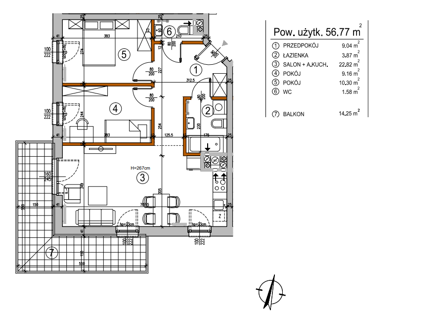 Mieszkanie o powierzchni 57 m2 w którego skład wchodzi: przestronny 23 m2 pokój dzienny wraz z aneksem kuchennym, łazienka 3,9m2 i WC 1,6m2 oraz dwie sypialnie 10,3m2 i 9,16m2. Dodatkowo narożny bardzo duży balkon o wielkości 14,25m2 daje zaciszne miejsce na wypicie porannej kawy :).
