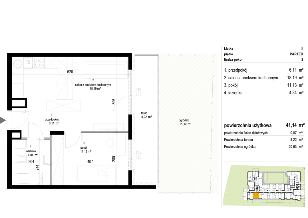 Mieszkanie o powierzchni 41,14 m2 w którego skład wchodzi: przestronny 18,19 m2 pokój dzienny z aneksem kuchennym, łazienka 4,84m2 oraz oddzielna sypialnia 11,13m2 doświetlona oknem z tarasu.